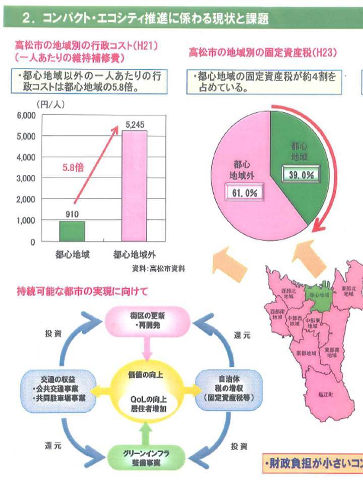 高松市都市計画課 コンパクト・エコシティ推進室の資料をみた。高松市の都心地域の1人当たり行政コストは都心地域以外の行政コストの5分の1未満である。